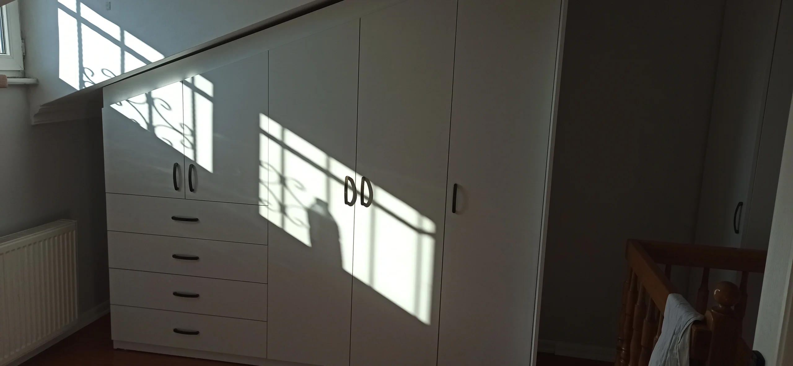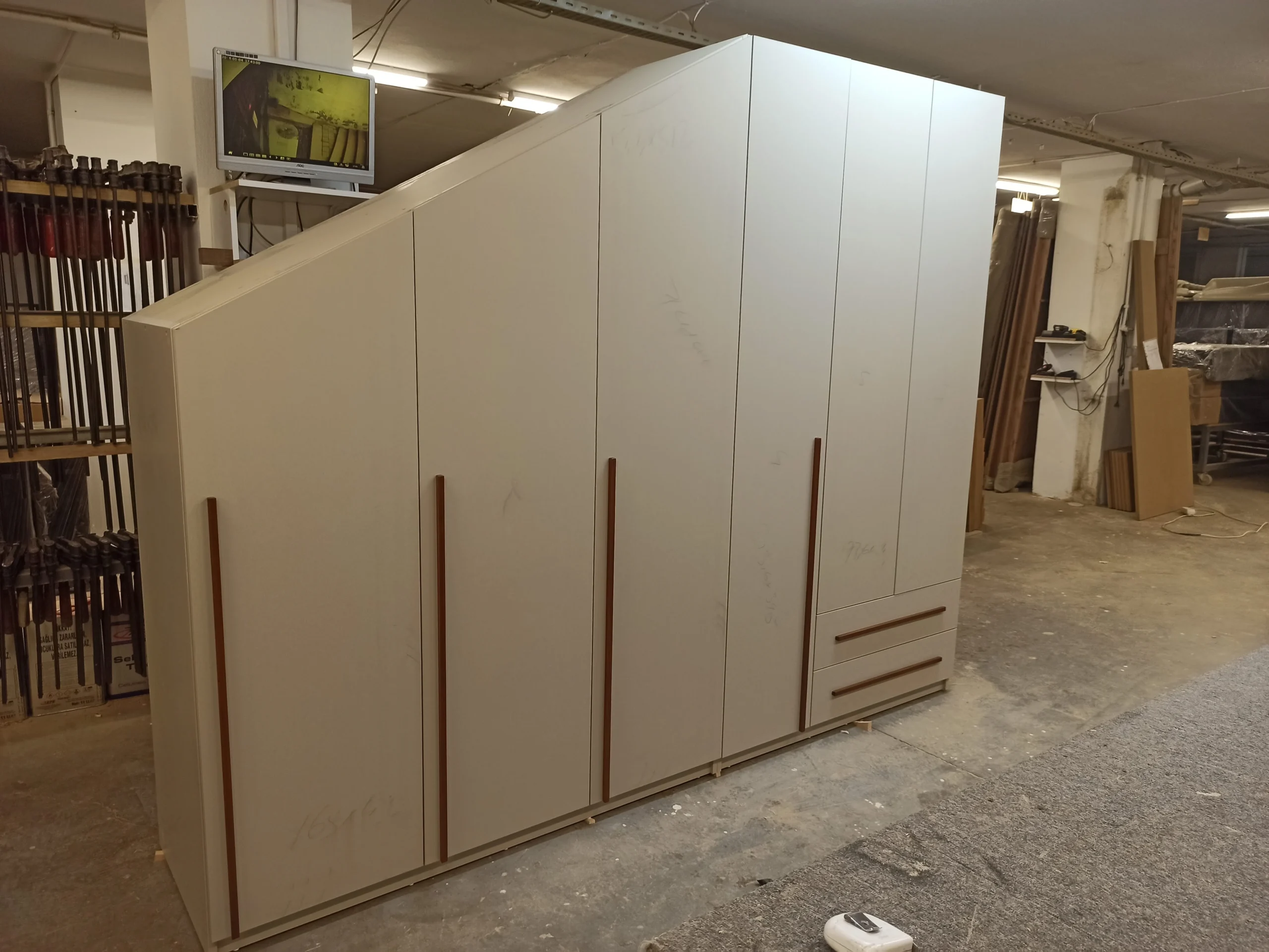 Eğimli tavanlarda 1 santimetrelik hata bile dolabın tavana oturmamasına sebep olur. Uzman ekiplerimiz, dijital lazer ölçüm cihazlarıyla odanızın açısını (derecesini) milimetrik olarak hesaplar. Dolabınız, tavandaki eğime sıfıra sıfır (boşluksuz) oturur.