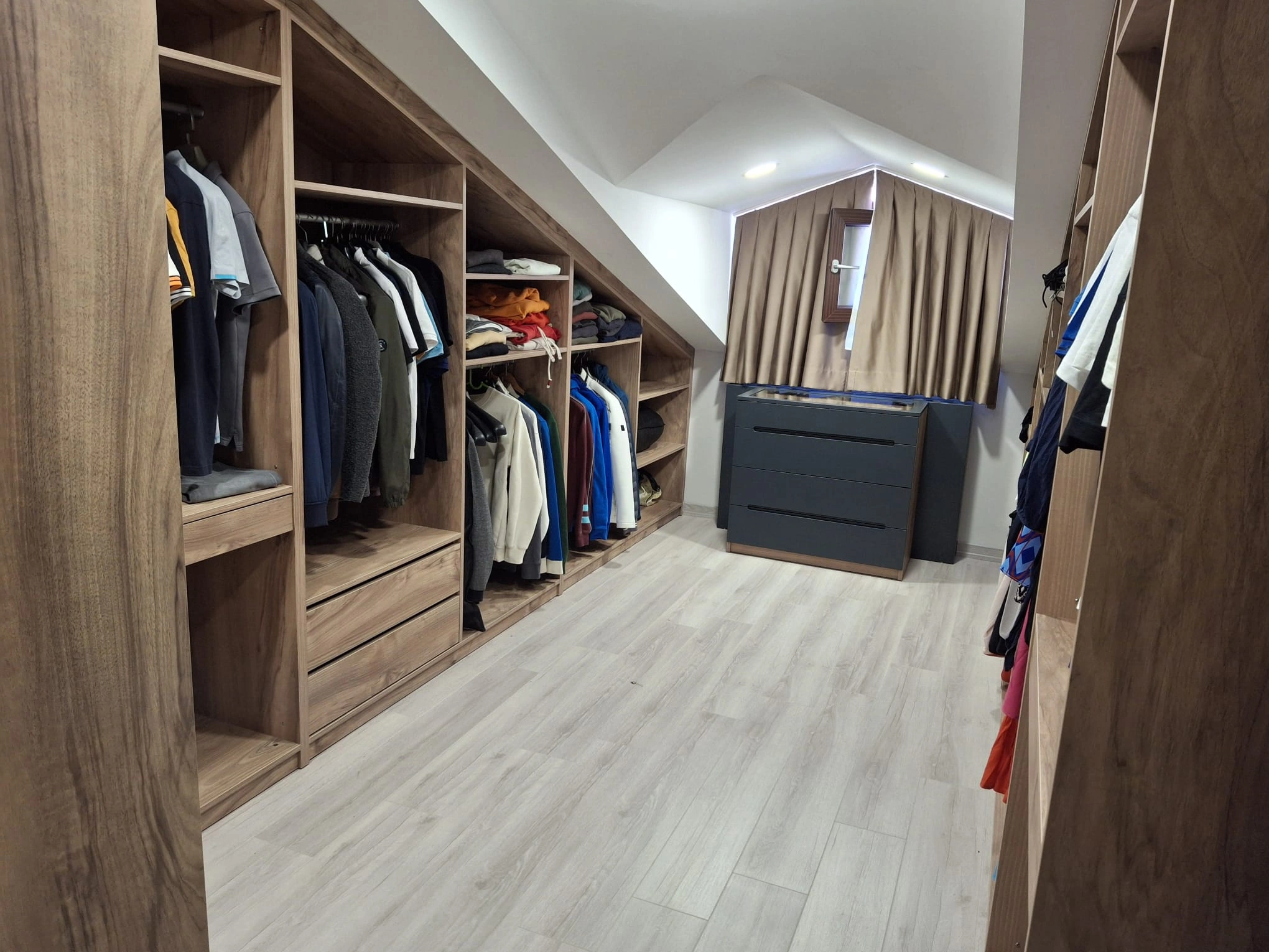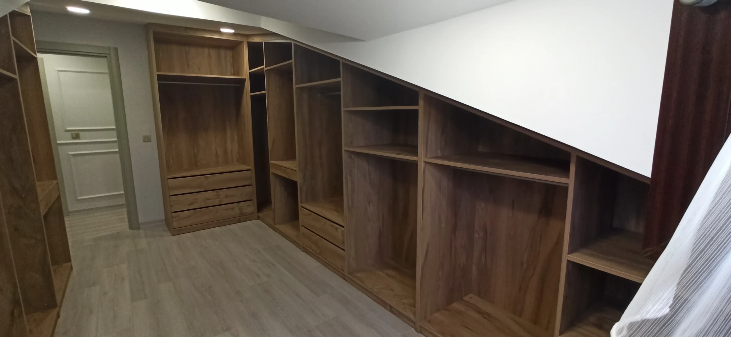 Çatı katları, merdiven altları ve eğimli tavanlara sahip odalar, standart mobilyalarla dekore edilmesi en zor alanlardır. Homelli Özel Üretim Çatı Katı Dolapları; bu "ölü" alanları %100 verimlilikle, milimetrik bir kusursuzlukla değerlendirmenizi sağlar. Lazer ölçüm teknolojisi ve CNC kesim hassasiyetiyle üretilen dolaplarımız, odanızın tavan eğimine birebir uyum sağlayarak hem estetik bir görünüm hem de devasa bir depolama hacmi yaratır.