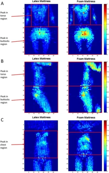 Arka duruş için, basınç karşılaştırması için arka gövde ve kalça bölgeleri tanımlanmıştır. Yan duruş için bölgeler, yan gövde (üst kol ve omuz dahil) ve kalçalardı. Ön duruş için sadece ön gövde (göğüs ve mide bölgesi) belirlendi. Lateks ve poliüretan köpük şilteleri karşılaştırmak için iki sonuç ölçüsü, yani her bir bölgedeki ortalama pik vücut temas basıncı ve her bir bölgeden yakalanan pikselli verilere dayanarak ortalama vücut temas basıncı dağılımı değerlendirildi. Video için, her duruş için 1 dakika ila 6 dakika arasındaki her dakika aralığında 6 kare işlendi; burada ortalama pik vücut temas basıncı ortalama 6 karenin üzerindeydi. Ortalama basınç dağılımı için eşik 3 psi’ye ayarlandı,